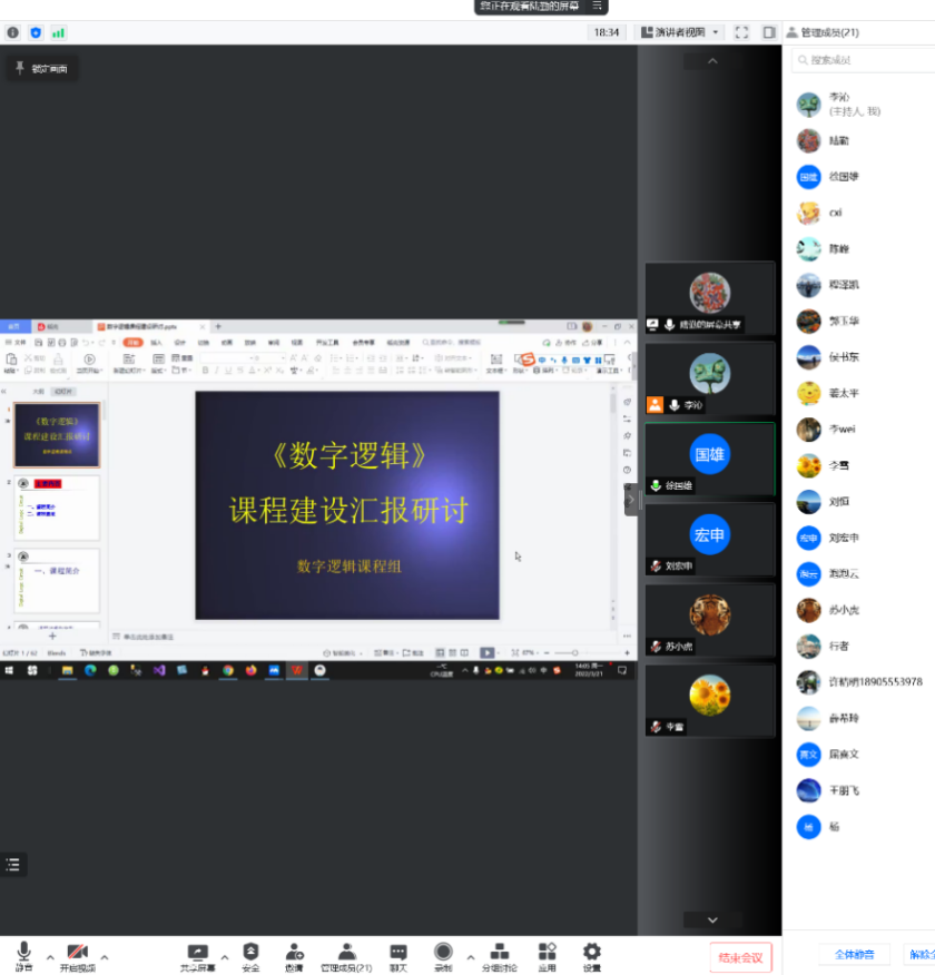 本次系室活动的主题是陆勤老师的“数字逻辑”课程建设,陆勤老师围绕数字逻辑课程建设历程和实践环节设计的进化介绍了自己的教学经验和思考;硬件课程的授课老师刘宏申、徐国雄、周义莲等就如何在计算机组成原理和数字逻辑这两门联系紧密的课程之间进行更为合理和有效的内容规划和实验贯穿设计进行了积极的讨论;刘恒老师提议介绍南京大学硬件课程教学改革的方案,为2022年培养方案的修订做准备。