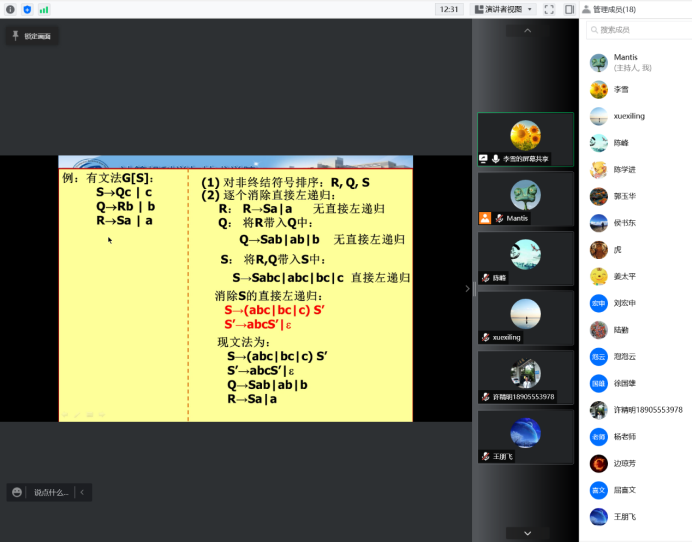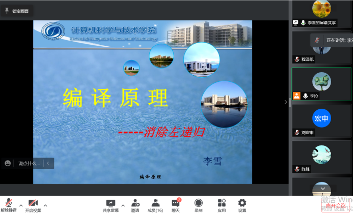 本次系室活动的主题是李雪老师的《编译原理》微课说课,说课的教学内容是“消除左递归”,李雪老师的教学准备充分、逻辑思路清晰、分析深入浅出。编译原理课程组负责人侯书东老师充分肯定了李雪老师在这门课的教学中的付出;计算机系的其他老师针对当前疫情下线上教学的特点讨论了如何加强师生互动、并确保教学效果的手段和方法;刘宏申老师也就课程的实践方案和课程目标发表了自己的看法。侯书东老师表示在修订2022版培养方案时需要把这门课程的课程目标进一步优化。
