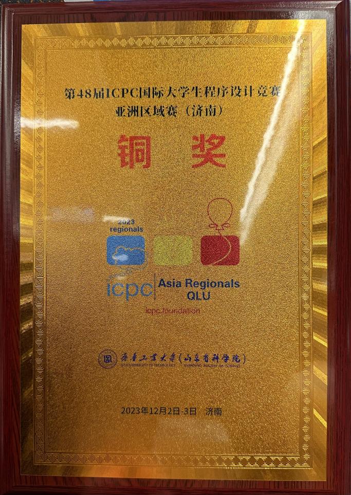12月2日-3日,第48届国际大学生程序设计竞赛亚洲区域赛(济南)在齐鲁工业大学(山东省科学院)举行。本次大赛共吸引来自北京大学、清华大学、香港大学、香港城市大学、浙江大学、复旦大学、上海交通大学、中国科学技术大学等全国224所院校的334支正式队伍,1002名选手参赛。我院由王喜凤、王广正老师指导,由林昊、高泽铭、万祎博组队参赛,经过连续5个小时编程解题的激烈比拼喜获铜奖。