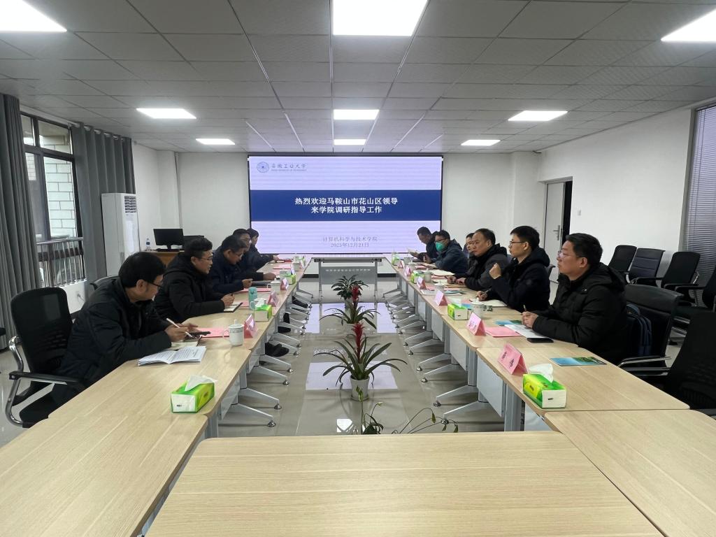 12月21日下午,马鞍山市花山区委书记张卫国,区委常委、组织部长彭冬,区委常委谢亚新,马鞍山软件园管委会赵伟等一行来学院调研交流,学院领导班子成员和科研团队负责人参加会议,会议由院党委书记韩军书主持。
