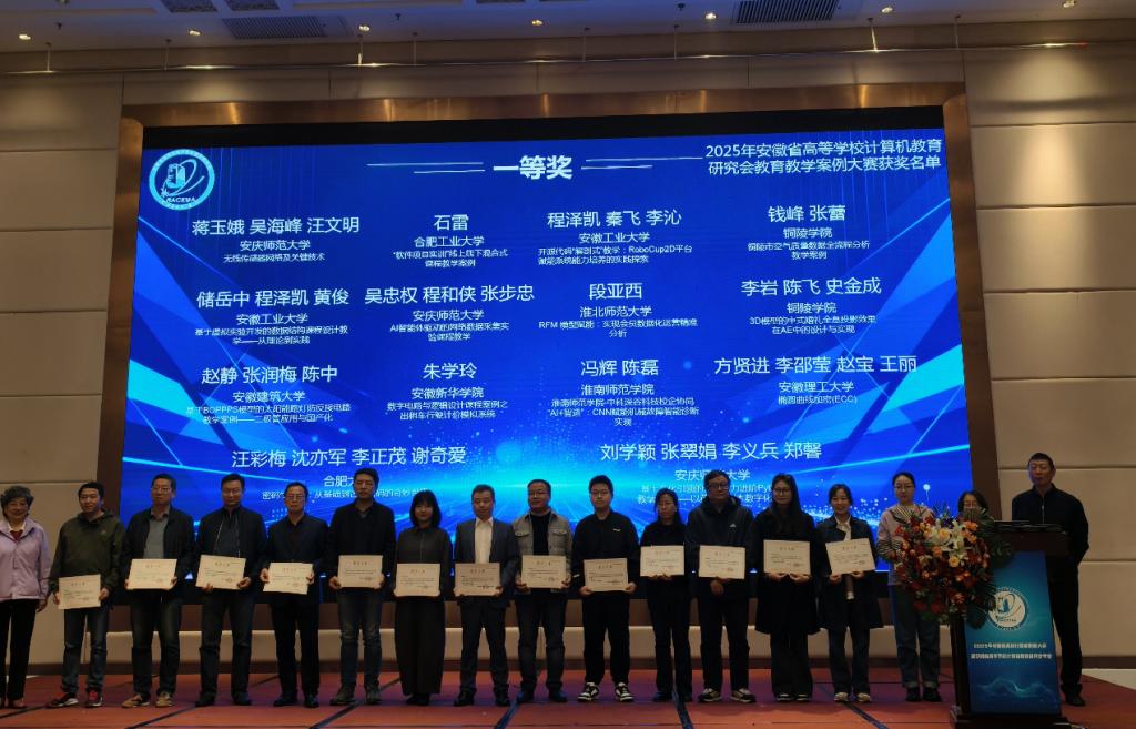 11月8日,2025年安徽省高校计算机教育大会在淮北市召开,我院副院长程泽凯、薛伟受邀率队参加会议。大会由安徽省高校计算机教育研究会、全国高校计算机基础教育研究会教育信息化专委会主办,淮北师范大学承办,以“智能时代计算机教育的守正与创新”为主题,吸引了来自省内外高校和企业的300余名代表参会。会上对本年度优秀教学案例、优秀硕士论文、专业建设教改项目进行颁奖。