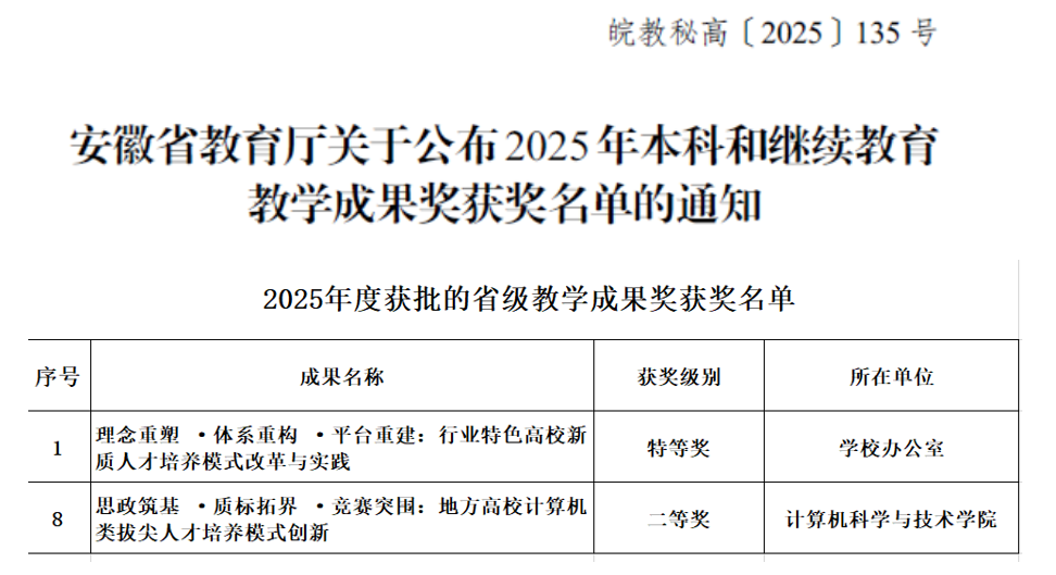 近日,安徽省教育厅公布了2025年本科教学成果奖获奖名单。我院在本次评选中取得重要突破,共获得两项省级奖励:由我院领衔申报的项目‌“思政筑基·质标拓界·竞赛突围:地方高校计算机类拔尖人才培养模式创新”荣获二等奖‌;同时,我院参与申报的项目‌“理念重塑·体系重构·平台重建:行业特色高校新质人才培养模式改革与实践”获特等奖‌。这标志着我院在省级教学成果奖项上实现了新的跨越。