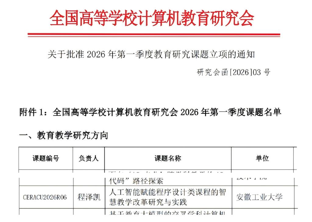 近日,全国高等学校计算机教育研究会公布了2026年第一季度教育研究课题立项结果,学院副院长程泽凯带领的教学团队申报的《人工智能赋能程序设计类课程的智慧教学改革研究与实践》成功获得立项。
